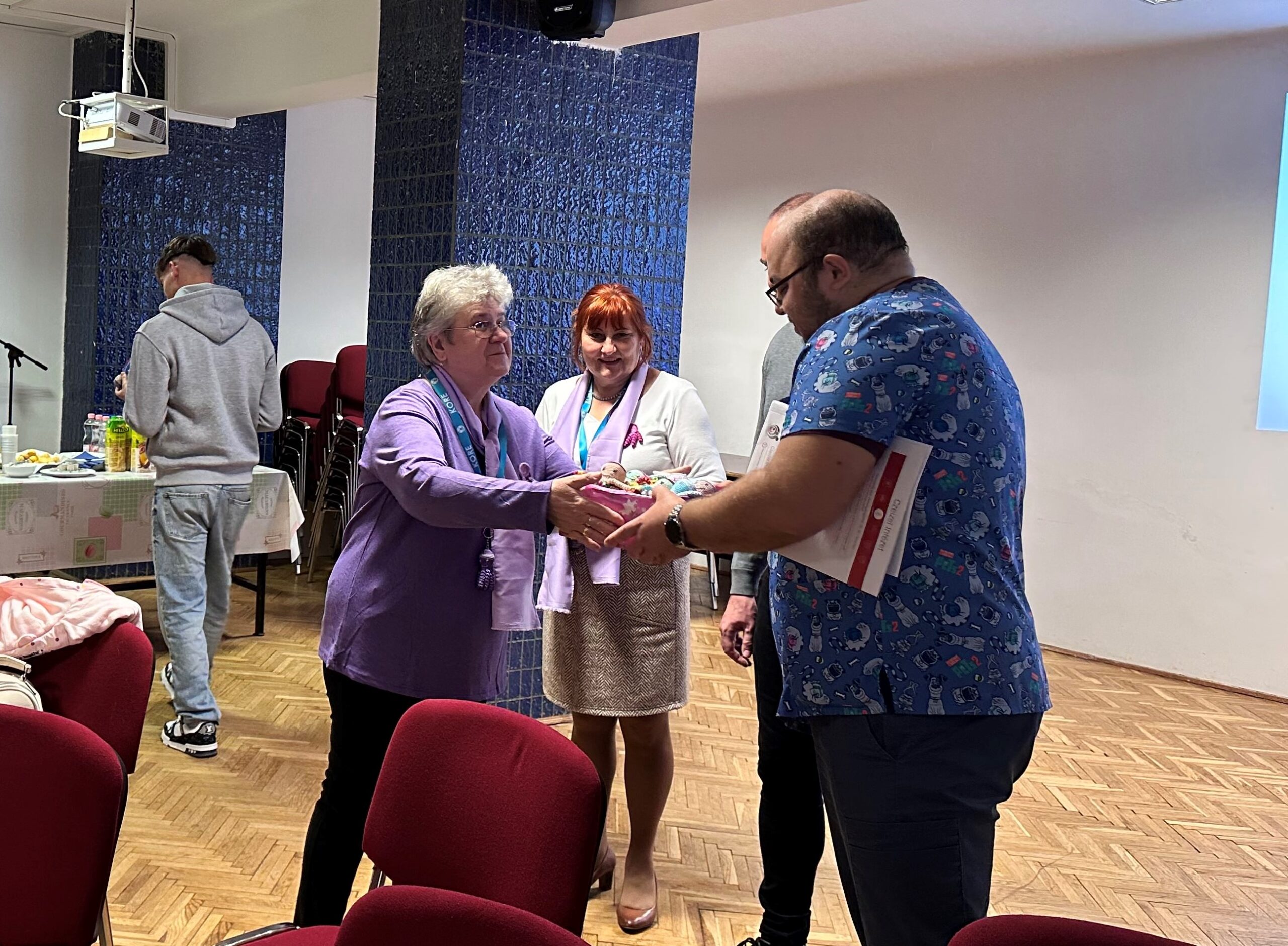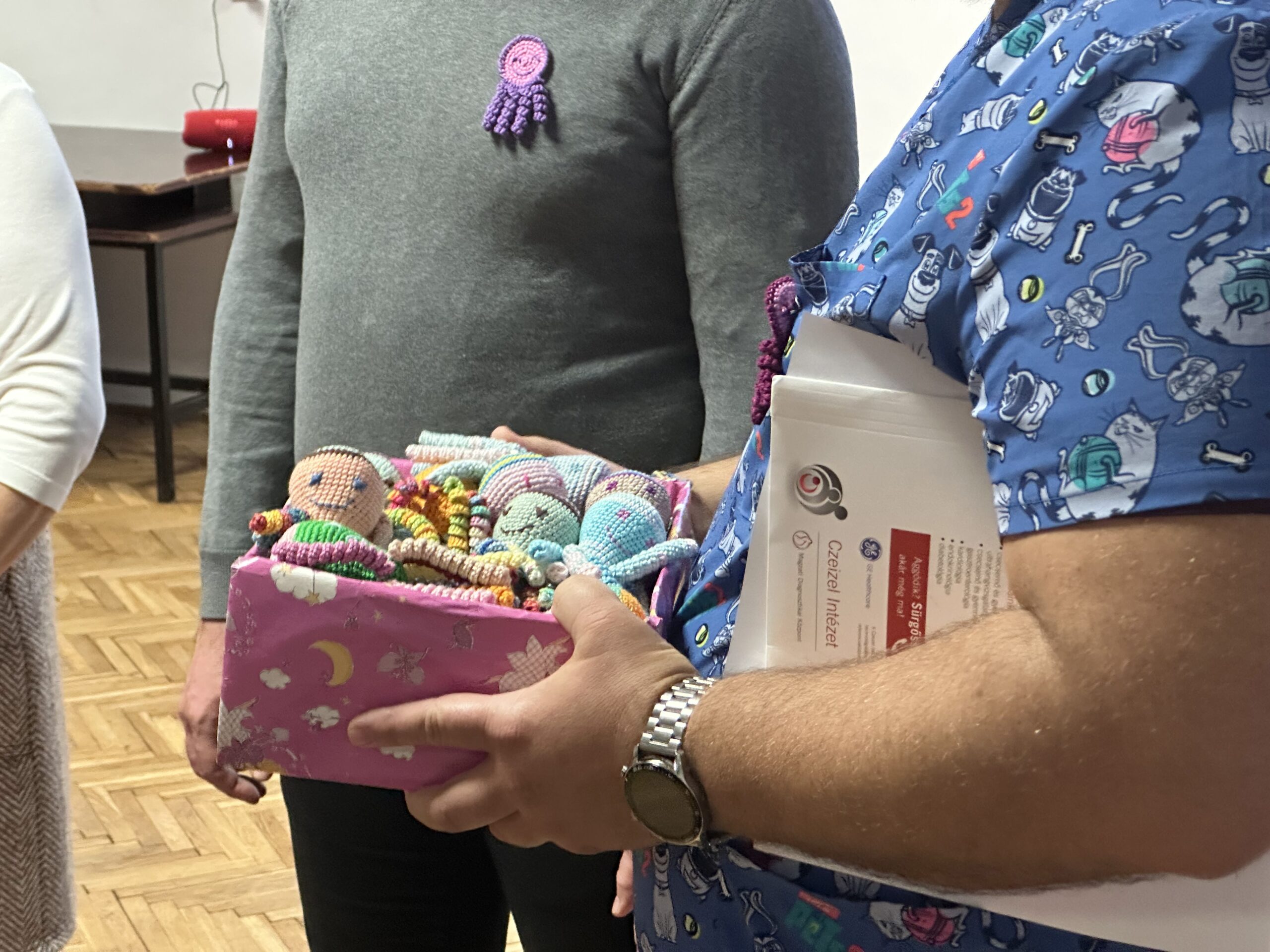 A nap megható momentuma volt, amikor Handa Györgyné Katalin horgolt koripokat adott át dr. Varga Imrének. Ezek az apró, szeretettel készített figurák sok koraszülött baba számára jelentenek biztonságot és kapaszkodót az első napokban.